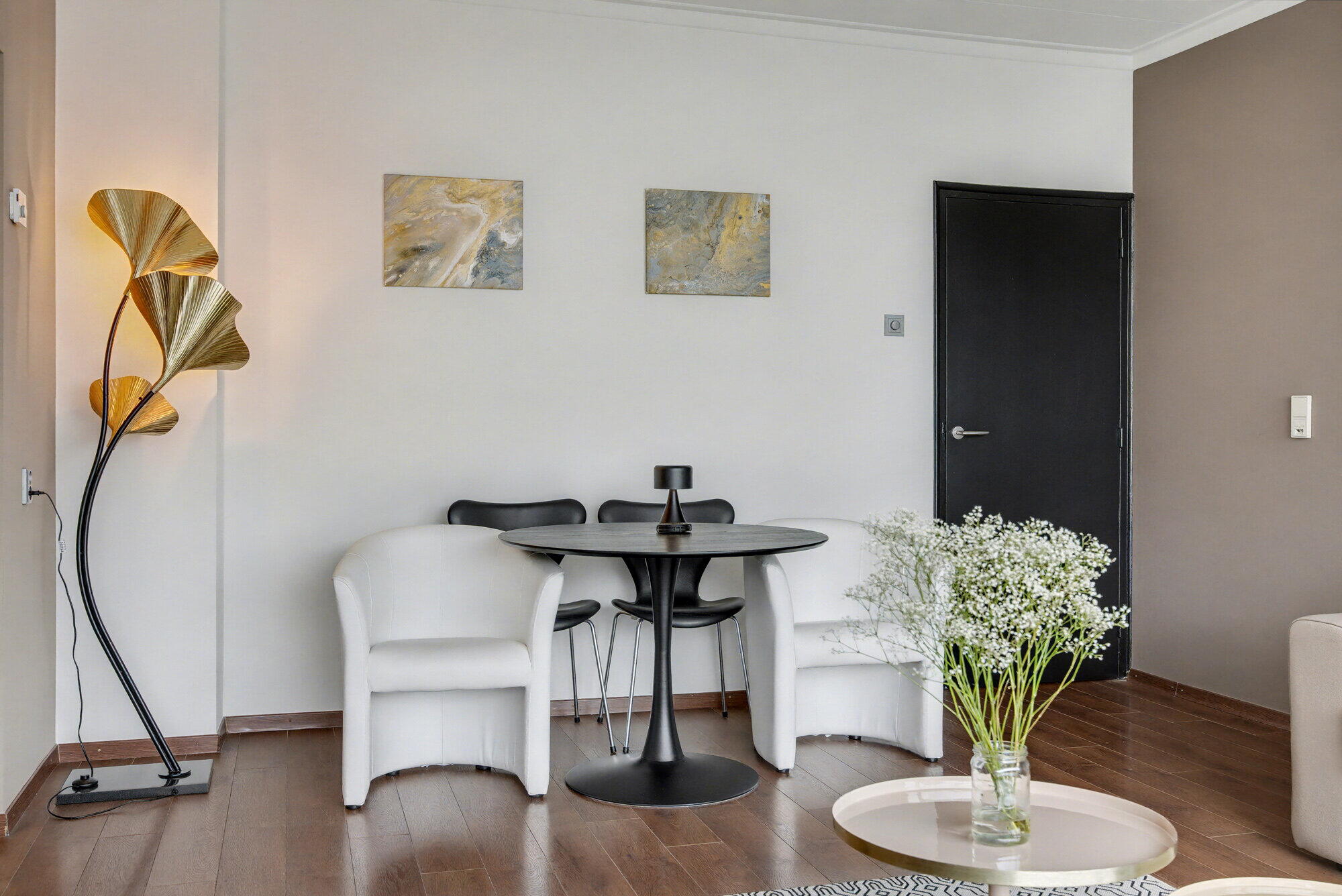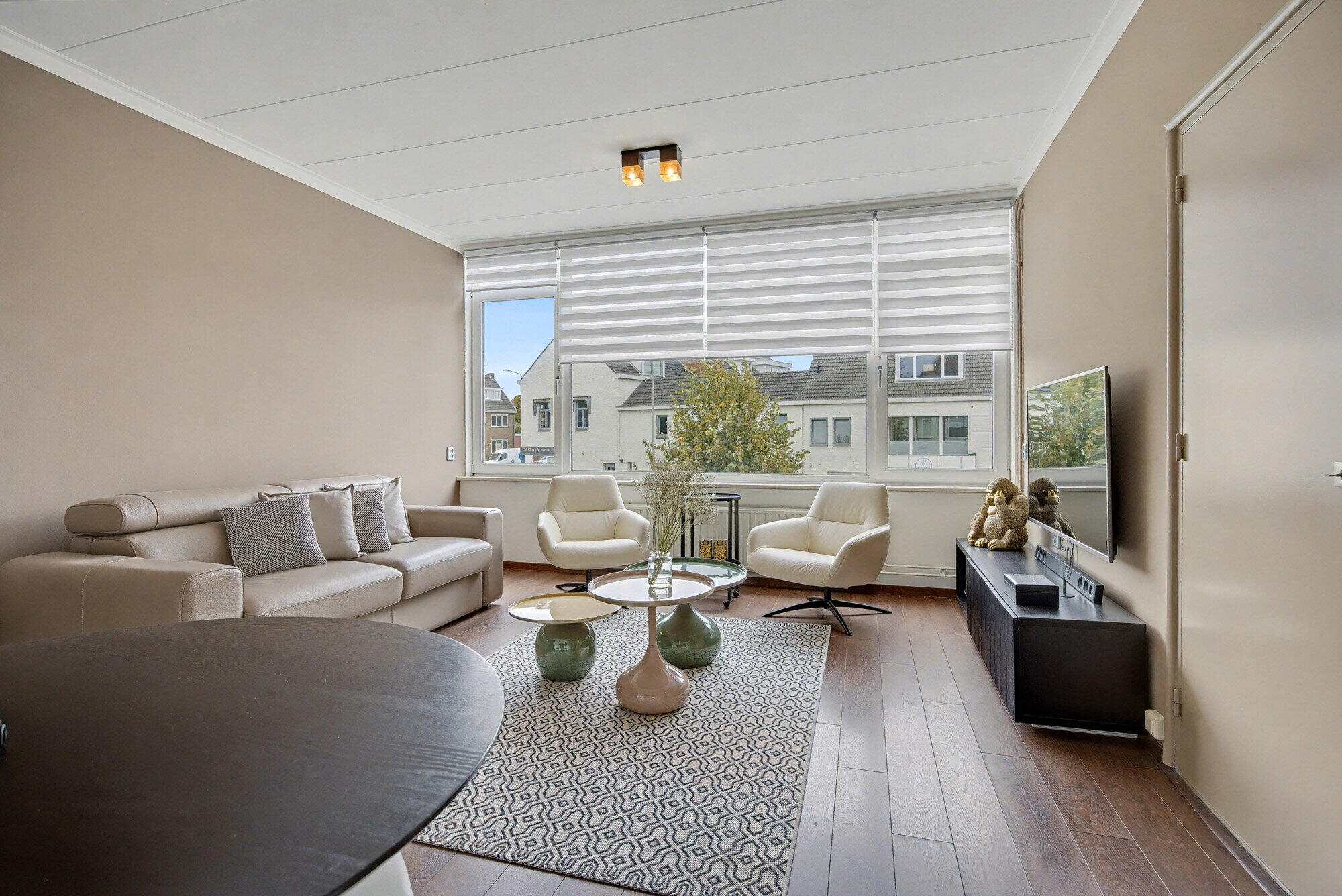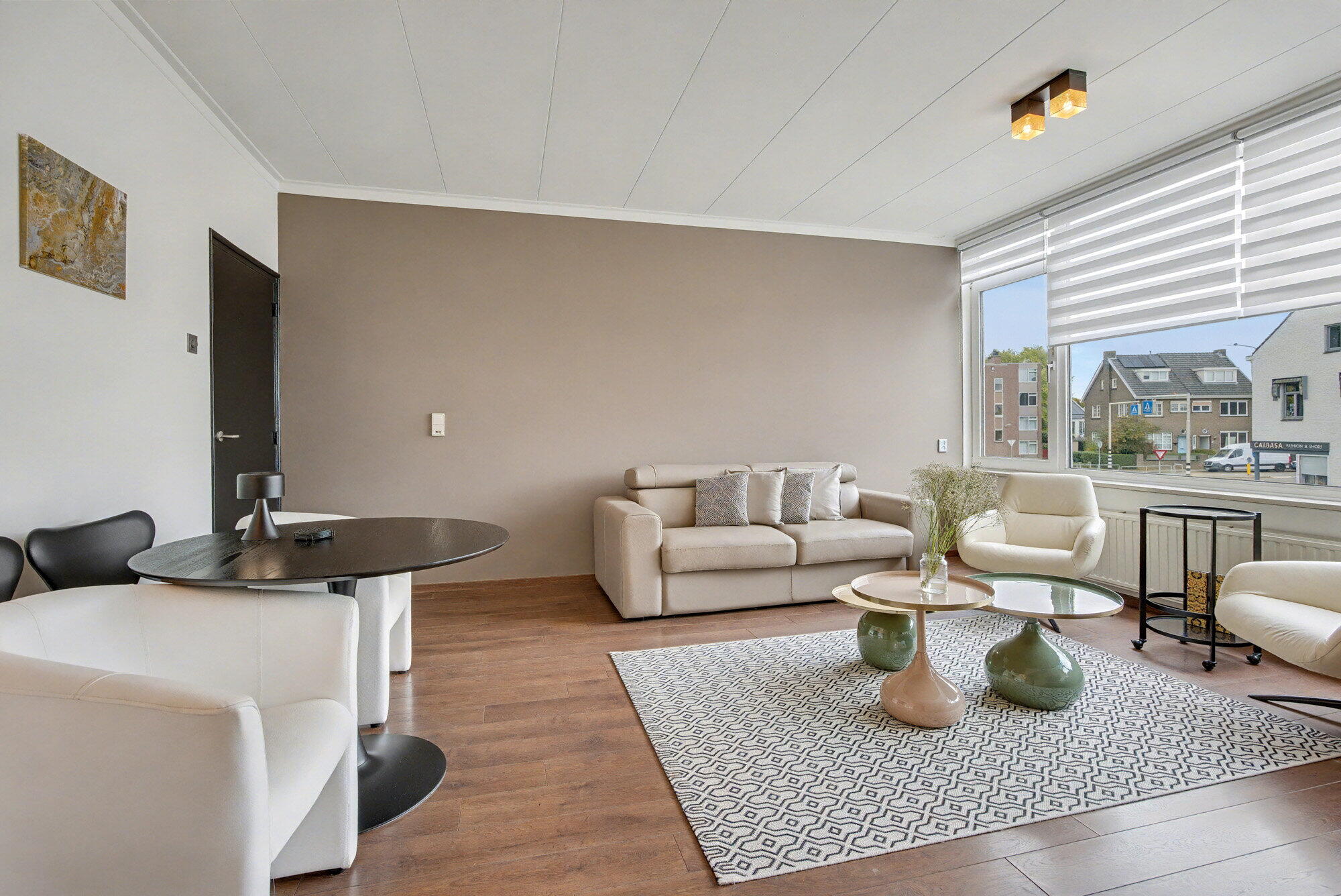 De open woonkamer vormt een naadloze combinatie van woon- en eetruimte, met overal warme houten vloeren. Een strakke eetset en eigentijdse meubels, waaronder een zachte bank en accentstoelen, creëren een samenhangende en uitnodigende sfeer. Grote ramen laten veel natuurlijk licht binnen en bieden uitzicht op de omgeving.