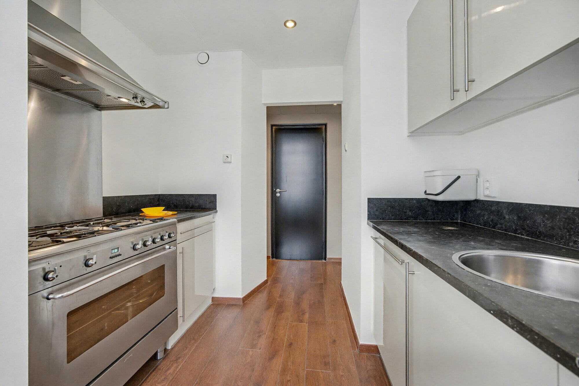 De keuken is compact, maar goed uitgerust met moderne apparatuur, waaronder een professioneel smeg gasfornuis met oven. Witte kasten en roestvrijstalen afwerkingen dragen bij aan de strakke, eigentijdse esthetiek. De badkamer is voorzien van frisse witte tegels, een zwevende wastafel, toilet en een douche, die de minimalistische ontwerpprincipes belichamen.