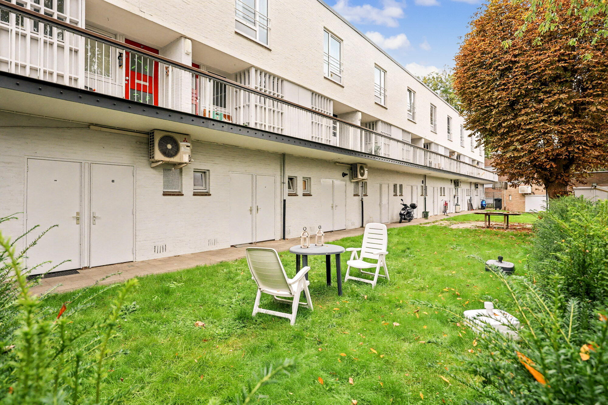Het appartement heeft een begane grond berging beneden en een gezamenlijke complextuin achter het gebouw.